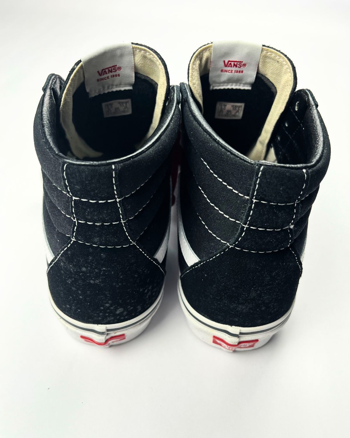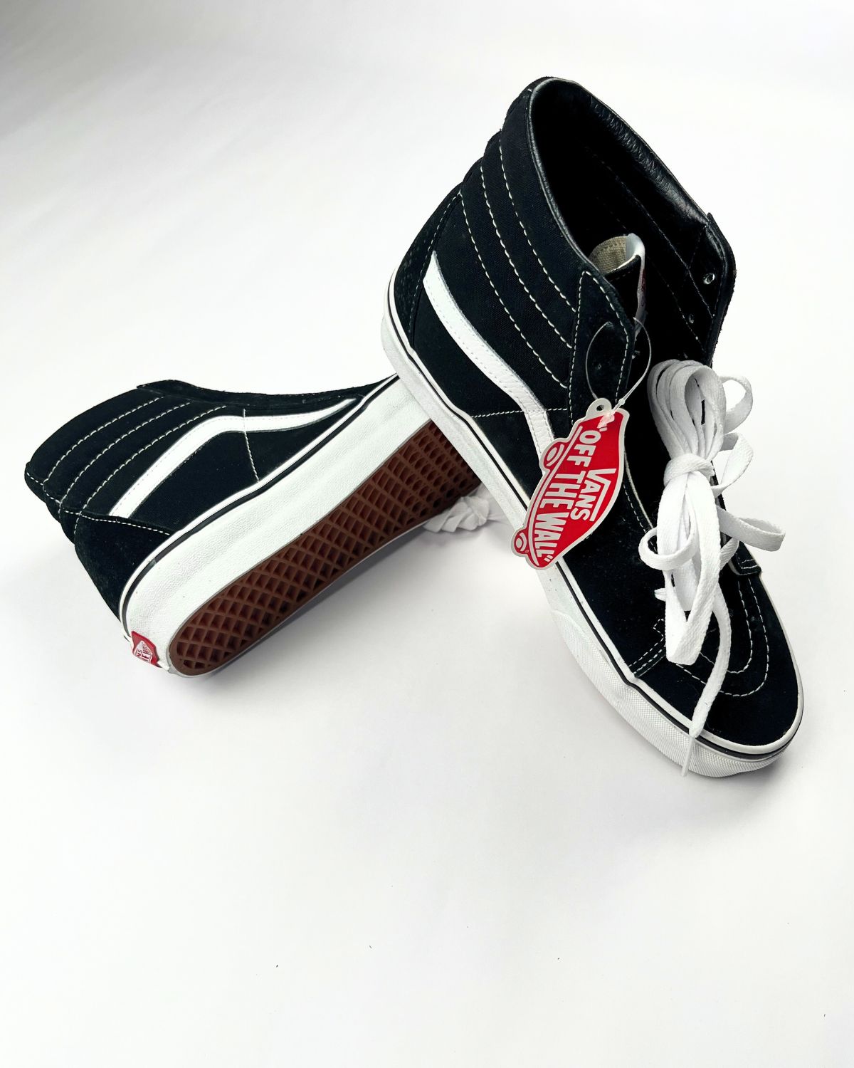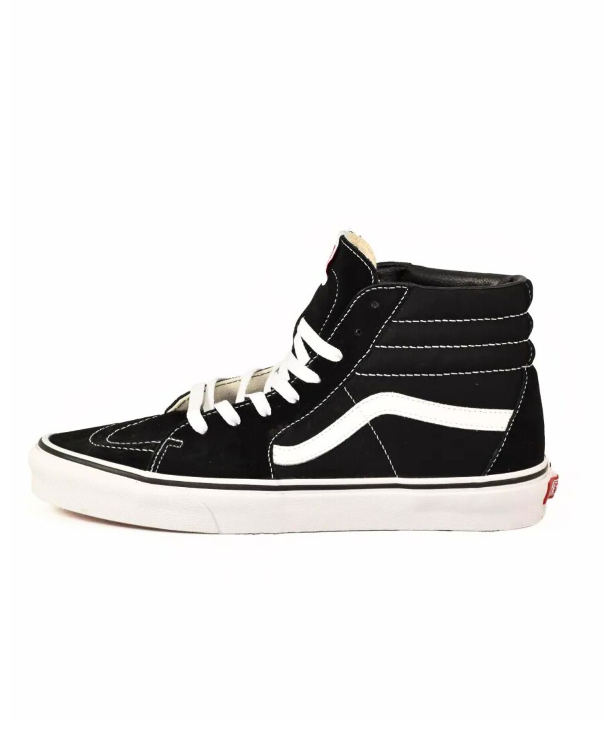 Iconiche Vans alte nere e bianche con tomaia in tela resistente, suola waffle antiscivolo e design intramontabile. Perfette per uno stile streetwear autentico e per un comfort quotidiano.